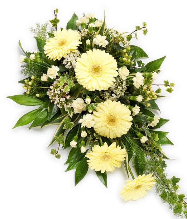 An elegant creamy white single ended spray. Yellow Gerbera, cream spray Carnations, Hypericums and white Viburnums are lovingly intertwined with variegated Dracaena, Foxtail Ferns, Cocculus and variegated Ivy.